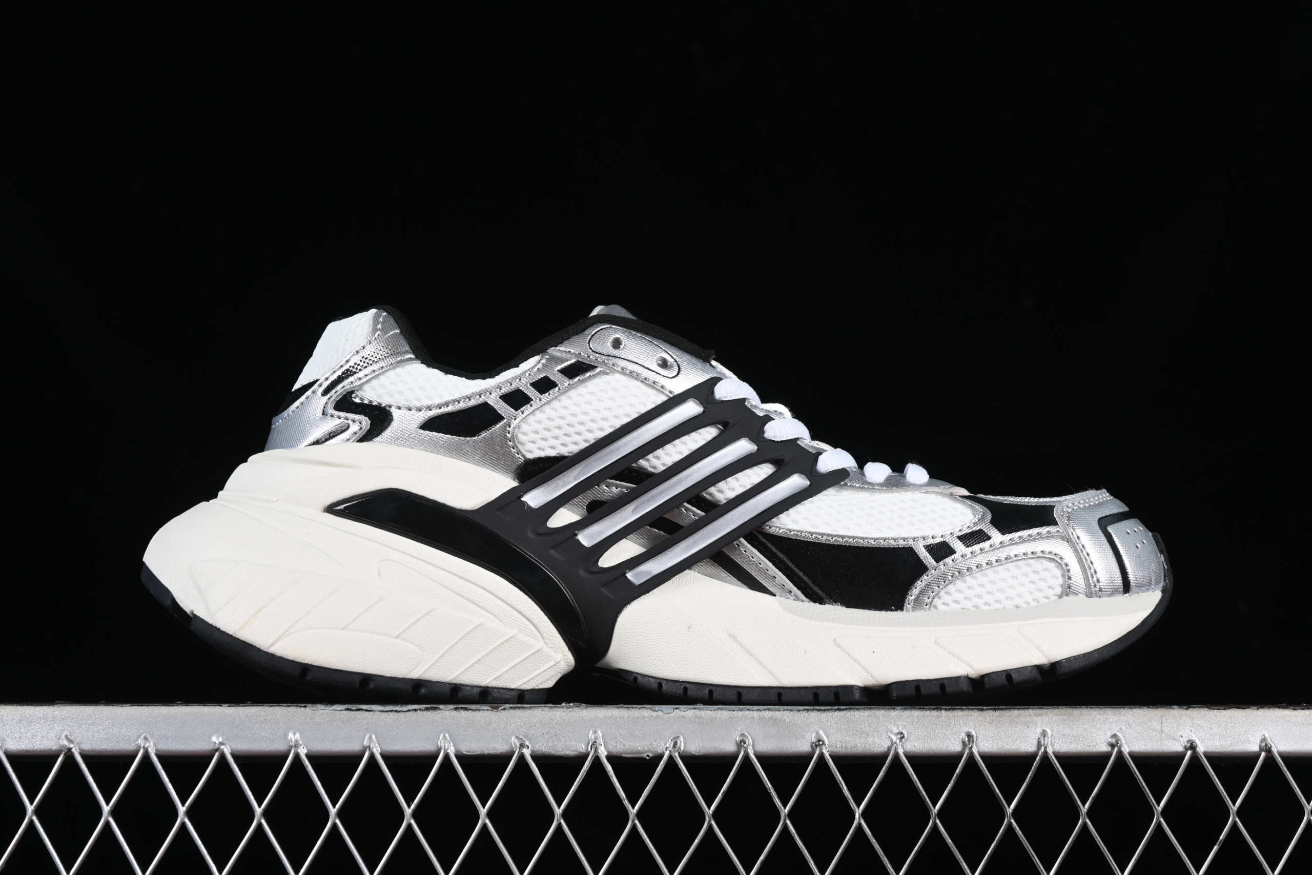 Сочетание белого, черного и мерцающего серебристого металлика создает яркий, динамичный образ, который притягивает взгляды. Детали из сетки и синтетических акцентов подчеркивают спортивный стиль.
