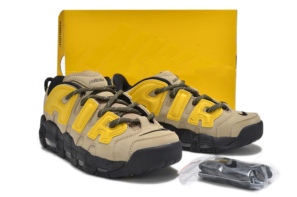 Ambush x Air More Uptempo Low в цвете Limestone переосмысляет знаковую модель Air More Uptempo через призму сдержанной палитры: мягкий каменно-бежевый тон делает кроссовки универсальным предметом гардероба, который легко сочетать с разными стилями. Верх выполнен из комбинации гладкой кожи и текстильных панелей с аккуратной прострочкой; объёмный фирменный «AIR» — главный дизайнерский акцент. Низкий силуэт обеспечивает свободу движений, а подошва с видимыми воздушными модулями даёт комфорт и амортизацию на весь день. Идеальны для тех, кто хочет мягкий, но выразительный акцент без ярких цветов.