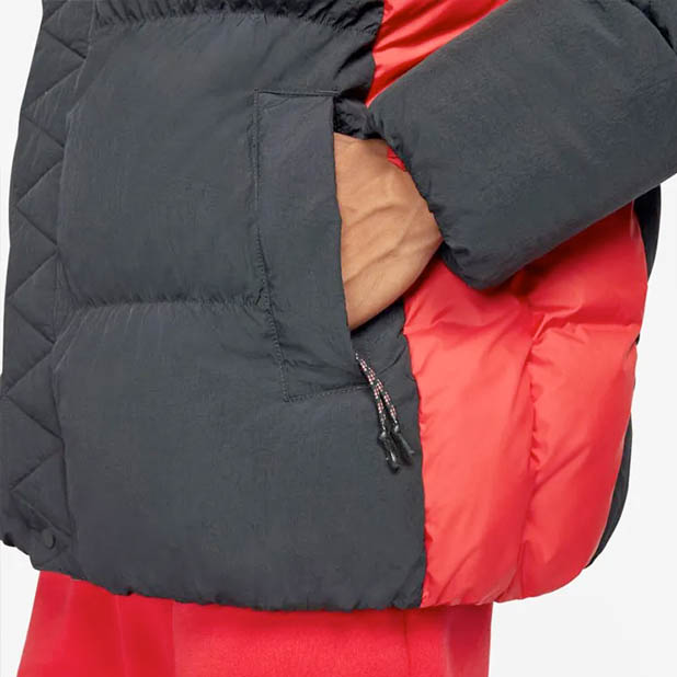 Классический силуэт с высоким воротником и капюшоном для дополнительной защиты от холода. Логотип Jumpman (эмблема Jordan) обычно размещён на груди.